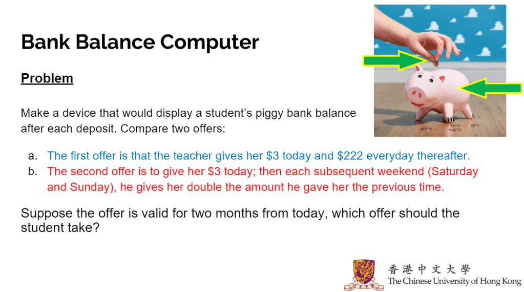 Make a device that would display a student’s piggy bank balance after each deposit. Compare two offers: